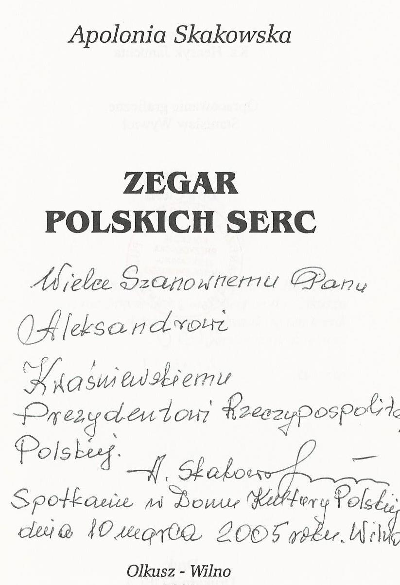 Zegar polskich serc / Apolonia Skakowska. - Olkusz-Wilno : Drukarnia DELA, 2001. - 86 s. : portr., err ; 20 cm.