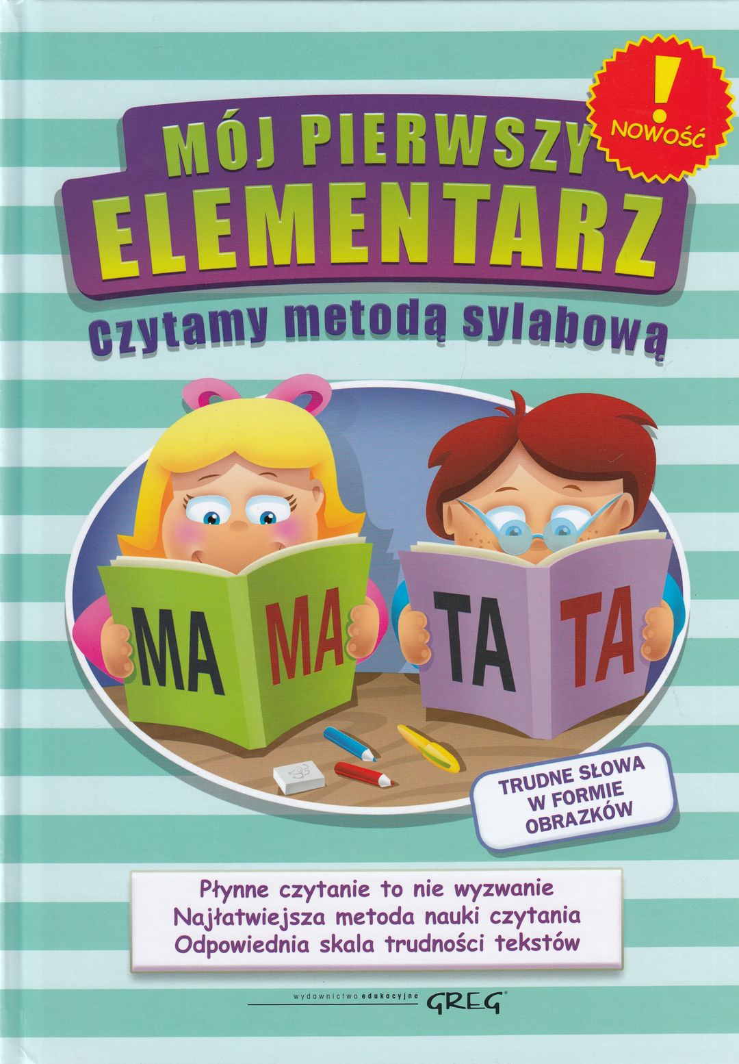 Na okładce: płynne czytanie to nie wyzwanie, najłatwiejsza metoda nauki czytania, odpowiednia skala trudności tekstów, trudne słowa w formie obrazków.
