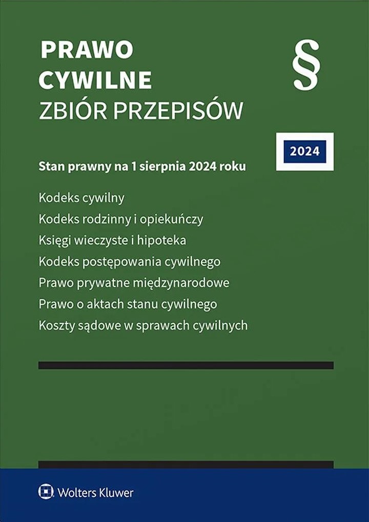 Prawo cywilne : zbiór przepisów 2024. - Stan prawny na 1 sierpnia 2024 roku. - Warszawa : Wolters Kluwer, 2024. - 1282, [6] stron ; 21 cm.