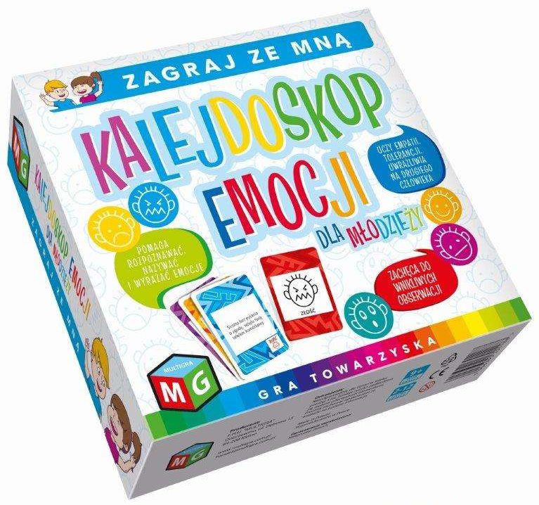 "Kalejdoskop emocji dla młodzieży" to gra towarzyska, polecana uczniom starszych klas szkoły podstawowej i młodzieży. Gra posiada dwa warianty rozgrywki, które w przyjemny sposób uczą rozpoznawania, nazywania i wyrażania emocji oraz zachęcają do wnikliwych obserwacji. " Kalejdoskop emocji" uczy empatii, tolerancji, właściwych relacji interpersonalnych, uwrażliwia na drugiego człowieka. Gra wyzwala pozytywne emocje, pobudza wyobraźnię oraz stymuluje umiejętność myślenia przyczynowo- skutkowego. Uczestnicy zabawy ćwiczą spostrzegawczość, koncentrację uwagi i pamięć. Gra rozwija umiejętności werbalne, a także pomaga w rozumieniu sensu informacji podawanych w formie uproszczonych rysunków, symboli.