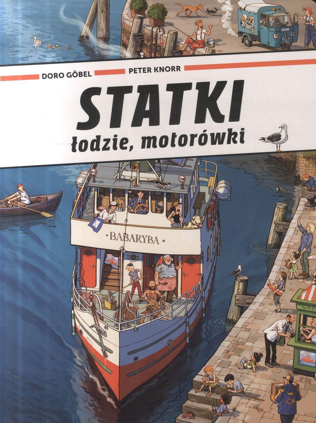 Wyruszamy w rejs po rzece, na której panuje bardzo duży ruch. Wybierz statek, którym chcesz podróżować i wskakuj na pokład! Masz do wyboru: motorówkę, żaglówkę, barkę, kuter, ponton, prom, statek pasażerski i łódź policyjną. Odwiedzimy stocznię, park wodny, nadbrzeżną kawiarnię, lodziarnię, tawernę oraz ogromny port. A może wolisz podróżować lądem? Nie brakuje tu aut osobowych i ciężarowych, traktorów, motorów, skuterów, rowerów, a nawet elektrycznego segwaya... Ahoj, przygodo! STATKI, ŁODZIE, MOTORÓWKI to wielkoformatowa książka obrazkowa (picturebook) z twardego kartonu - każda rozkładówka to kolorowa panorama pełna niezwykłych przygód, z której oglądania nawet najmłodsze dzieci będą czerpać radość, rozpoznawać ulubione pojazdy i postacie oraz śledzić niezliczoną ilość zmieniających się szczegółów.