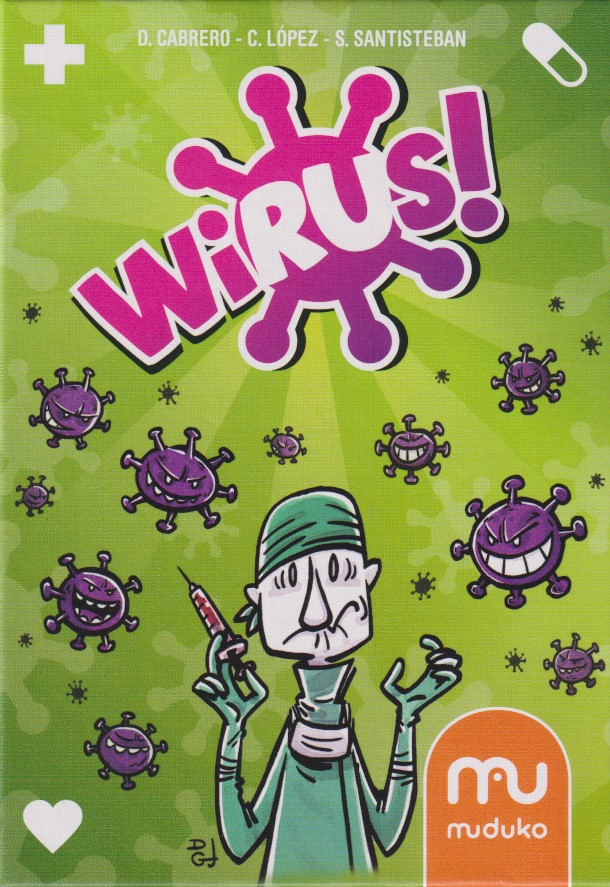 Wirus! / D. Cabrero, C. López, S. Santisteban ; ilustracje David GJ. - Podłęże : Wydawnictwo Muduko, 2022. - 1 gra (68 kart) : karton, tektura, kolor ; w pudełku 15x11x6 cm + instrukcja ([2] strony : ilustracje ; 43 cm).