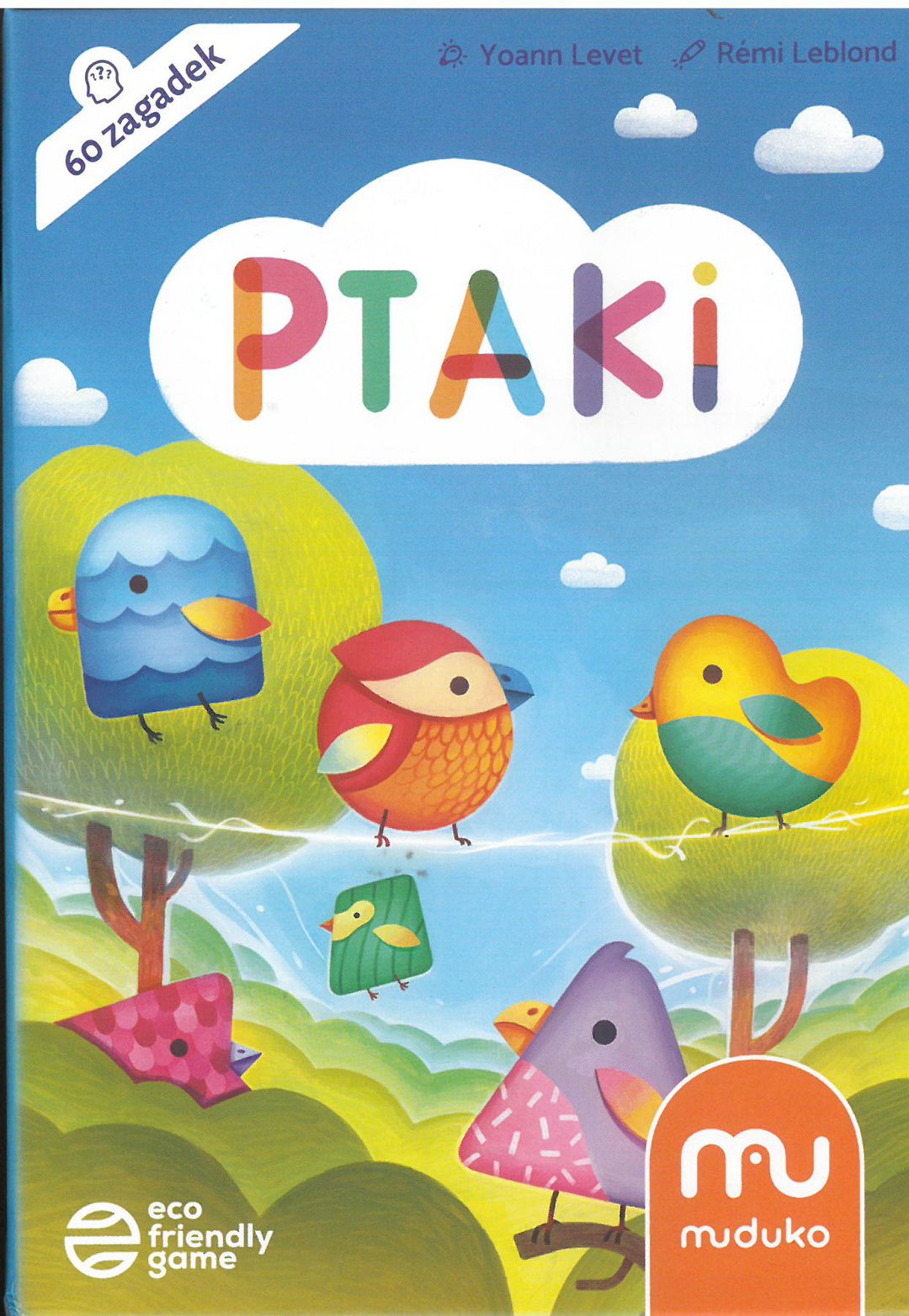 Ptaki / autor Yoann Levet; ilustracje Remi Leblond; tłumaczenie Łukasz Małecki. - Podłęże : Muduko, 2022. - 1 gra (60 kartz zagadkami , 6 ptaków) :karton, tektura, kolor ; w pudełku 15x11x4 cm + instrukcja