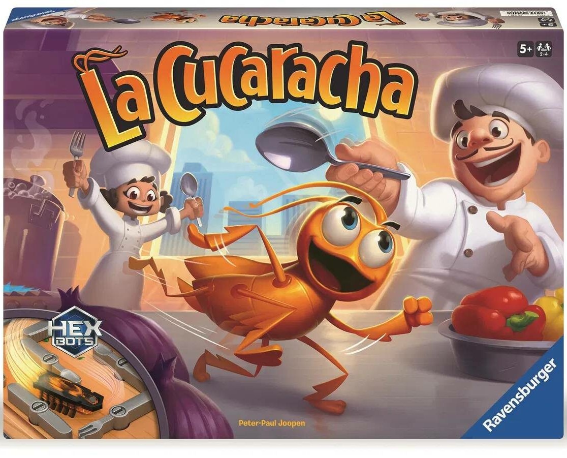 La cucaracha [Gra] / Peter-Paul Joopen. - Warszawa : Ravensburger [2024]. - 1 gra (1 robot (karaluch) (z dołączonymi bateriami), Plansza 3D, 18 ruchomych sztućców, 20 żetonów - karaluchów, 1 kostka, 2 pary drzwi, 4 pułapki ) : karton, plastik, ilustracje kolorowe w pudełku o wymiarach: 43x30x5 cm + instrukcja.